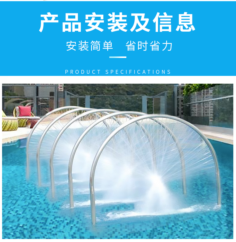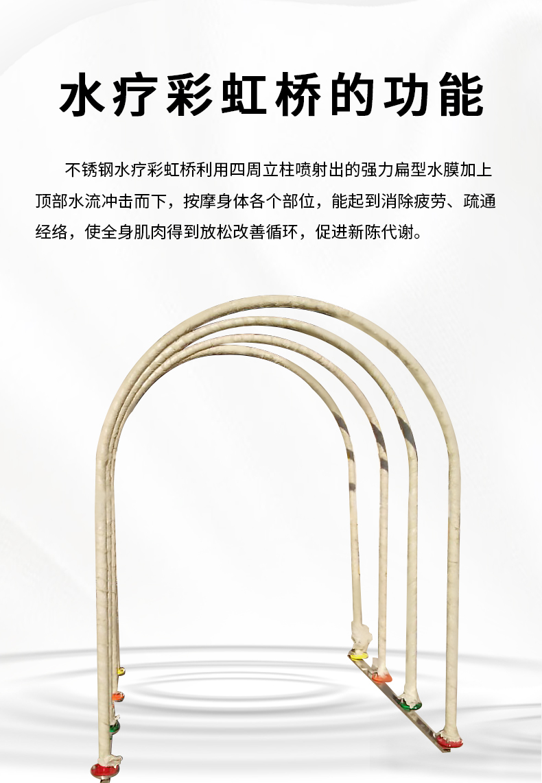 - 不銹鋼水療彩虹橋利用四周立柱噴射出的強(qiáng)力扁型水膜加上頂部水流沖擊而下,按摩身體各個(gè)部位,能起到消除疲勞、疏通 經(jīng)絡(luò),使全身肌肉得到放松改善循環(huán),促進(jìn)新陳代謝。