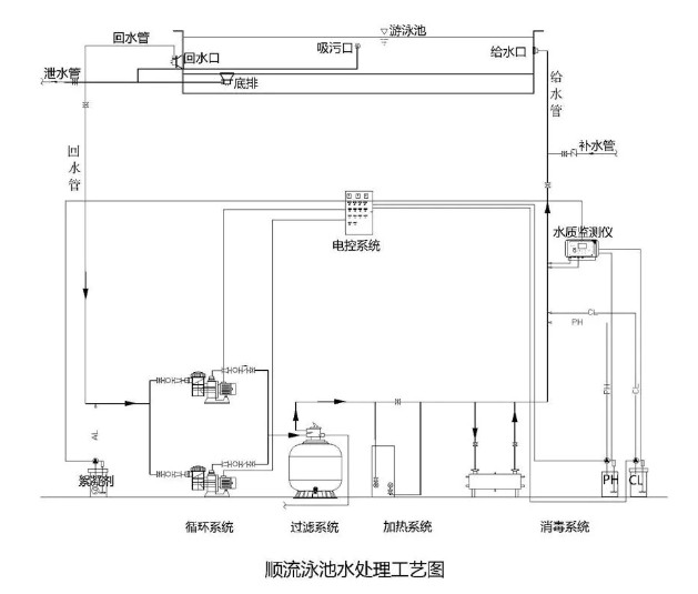 采用順流式的優(yōu)點(diǎn):①管線布置簡(jiǎn)單,不用設(shè)置平衡水箱等多余的設(shè)備,管理維護(hù)難度低,投資費(fèi)用省;②不用額外地增加循環(huán)水量,水處理系統(tǒng)效率高,運(yùn)行費(fèi)用省;③溢水溝溢水不回用,池水表面的漂浮物可經(jīng)池岸溢水溝排出泳池,從根本上杜絕了二次污染源。