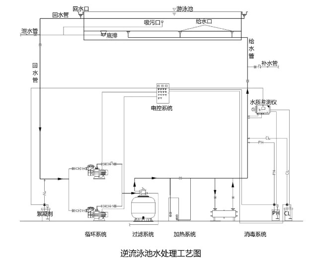 逆流式采用池底進(jìn)水,池岸溢水回水的循環(huán)方式,具體做法是在池底每條泳道線的投影線上,每3米設(shè)置一個(gè)布水口,同時(shí)在泳池兩側(cè)設(shè)置溢流溝,它實(shí)際上是采取上移式布水方式,即從池底進(jìn)水向水面推進(jìn),最后經(jīng)池岸溢流槽返回水處理機(jī)房。