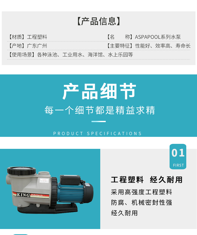 - 根據(jù)水力學(xué)原理設(shè)計(jì)的泵體,泵體、葉輪采用高強(qiáng)度工程塑料,經(jīng)久耐用。濾藍(lán)容量大,大大減少了清洗工作。性能好,效率高,加快了注水(灌溉)速度并提高了能源效率。適用于各種泳池、工業(yè)用水、海洋館、水上樂園等。