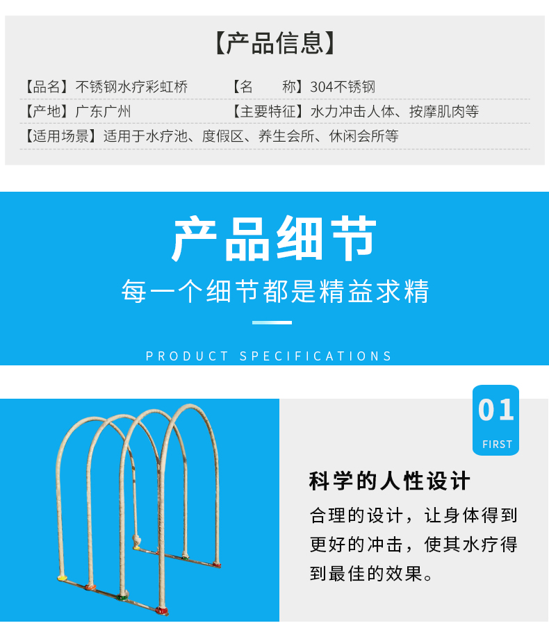 - 不銹鋼水療彩虹橋利用四周立柱噴射出的強(qiáng)力扁型水膜加上頂部水流沖擊而下,按摩身體各個(gè)部位,能起到消除疲勞、疏通 經(jīng)絡(luò),使全身肌肉得到放松改善循環(huán),促進(jìn)新陳代謝。